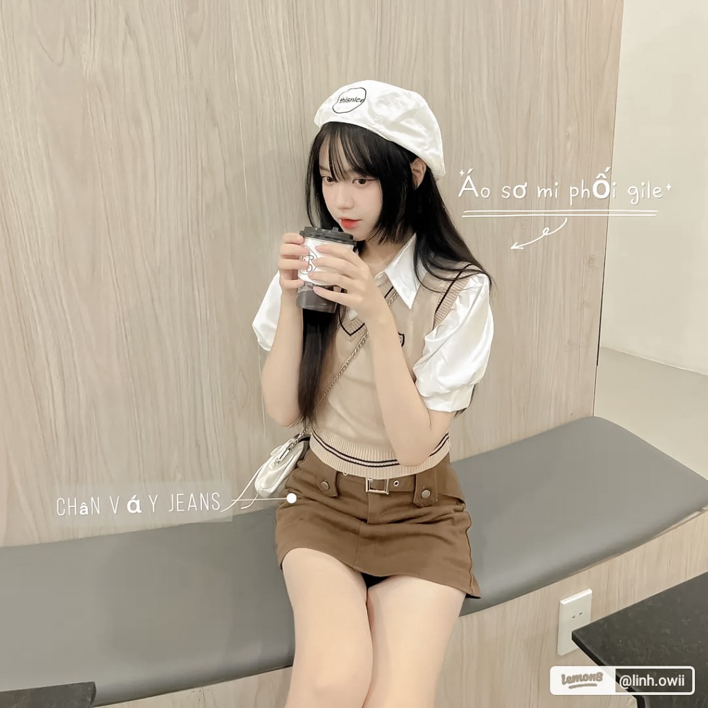Em áo sơmi phối gile đơn giản mix cùng chân váy jeans cùng tone màu cực xinhhh, mình phối thêm 1 chiếc nón beige trông cưng xĩuuu. Ngày nào cũng mặc xinh như này là có 1 đống hình sống ảo luôn 🫶🏻